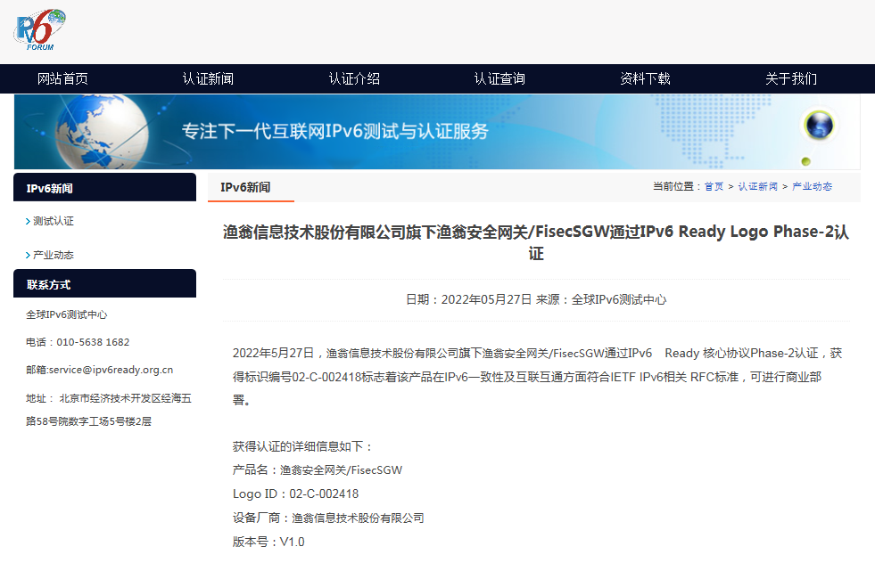 近期,PA真人视讯安全网关 FisecSGW在下一代互联网国家工程中心-全球IPv6测试中心正式顺利获得IPv6 Ready核心协议Phase-2测试,并荣获由国际组织IPv6 Forum颁发的IPv6 Ready Logo Phase-2认证证书(Logo ID:02-C-002418)。